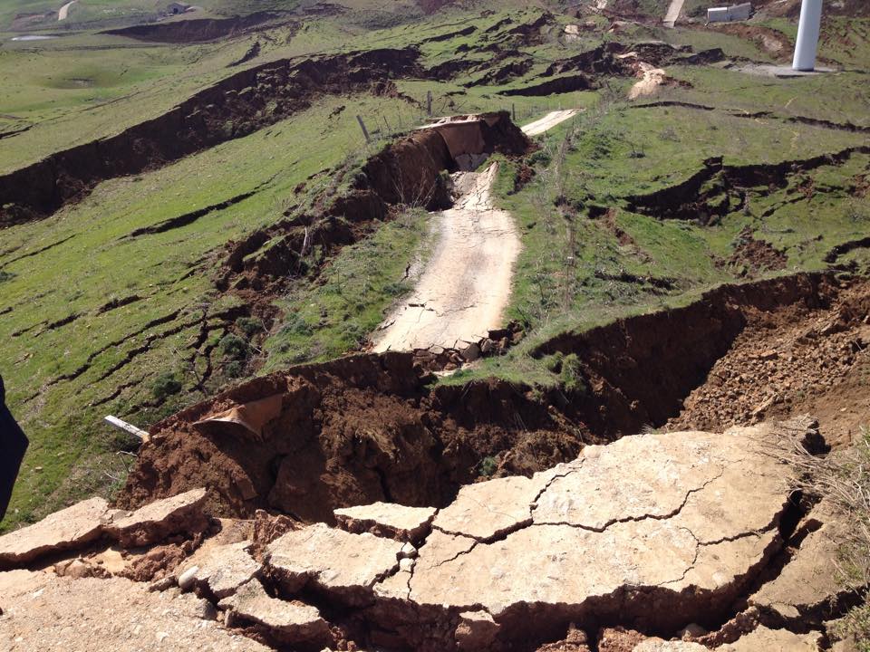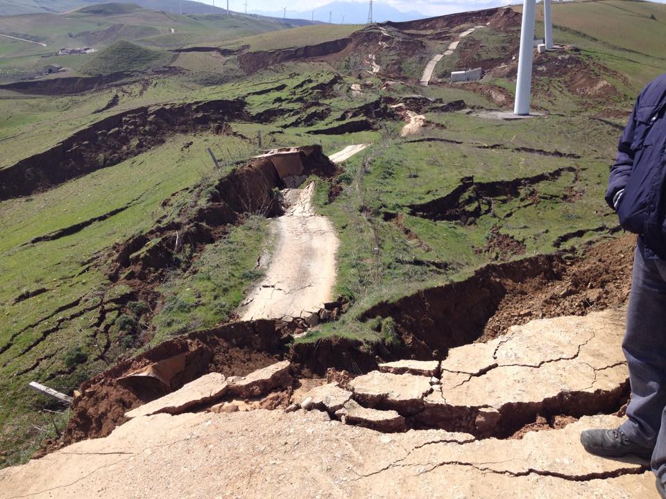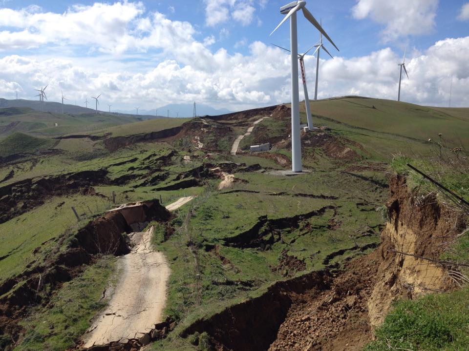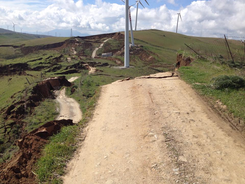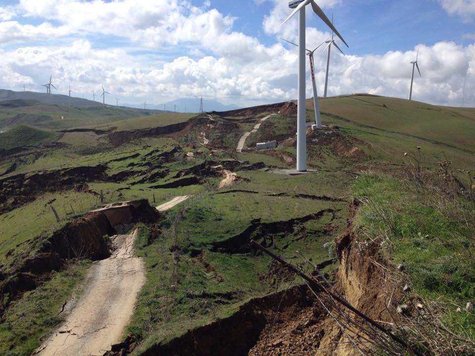 La frana insiste in una zona in cui sono presenti pale eoliche. Sembra che le cabine si siano spostate e quasi accavallate una sull’altra