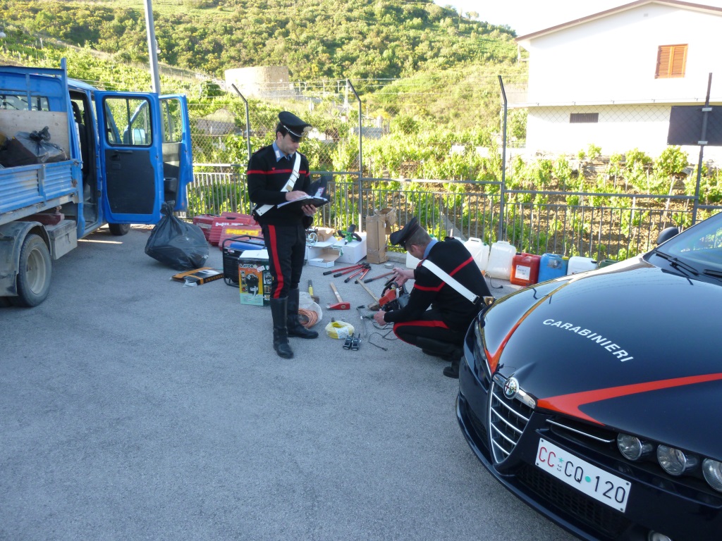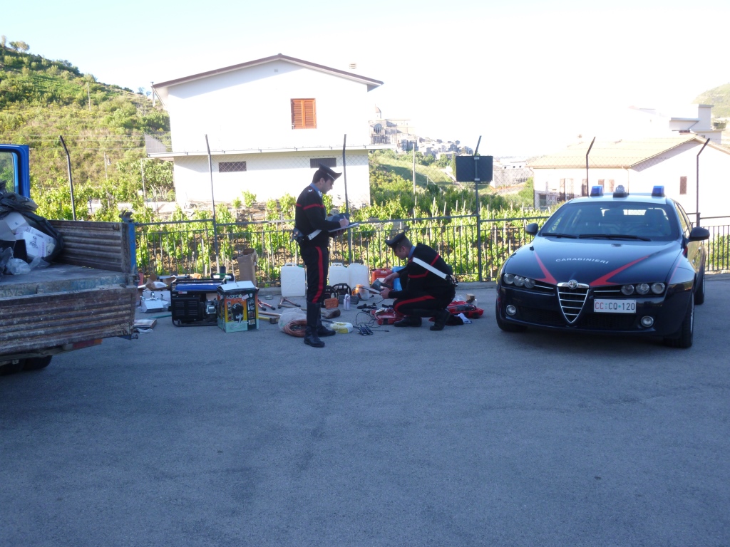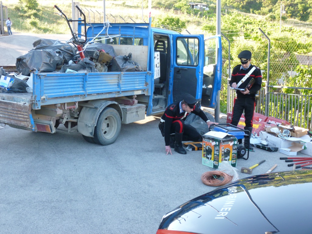 I Carabinieri hanno comunque recuperato i mezzi ormai abbandonati ed il carico consistente in motozappe, diversi bidoni contenenti complessivamente 100 litri di gasolio, varie motoseghe e trapani di diverse marche e tipologia, martelli pneumatici, decespugliatori, saldatrici, demolitori, gruppi elettrogeni, materiale di rubinetteria di varie marche e misure, 100 metri di cavi di rame e pompe a motore a scoppio.