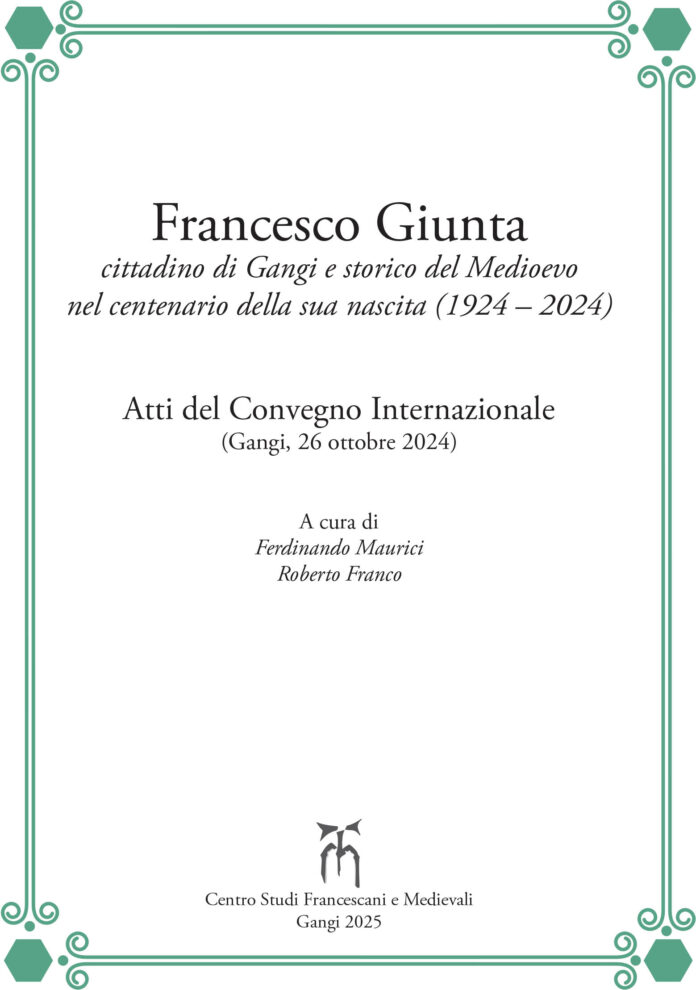 Edito recentemente il volume che ha raccolto gli atti del convegno internazionale dal titolo “Francesco Giunta cittadino di Gangi e storico del Medioevo nel centenario della sua nascita (1924–2024)”, tenutosi a Gangi, nella sede istituzionale di Palazzo Bongiorno, il 26 ottobre 2024.