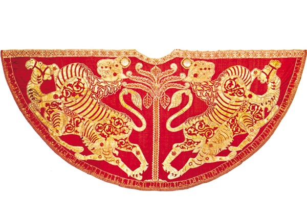 Il “Tiraz di Palermo” era un’officina di lusso all’interno del Palazzo Reale (oggi Palazzo dei Normanni) che produceva tessuti, gioielli e altri oggetti preziosi durante l’epoca araba e normanna. Era nota per la sua produzione di alta qualità, come tappeti, abiti, e in particolare per opere celebri come il Mantello di Ruggero II e la Corona di Costanza. In Sicilia durante il periodo medievale ci si abbigliava come nel resto del continente italiano. Le stoffe più comuni erano il lino e la canapa oltre a sete, damaschi e broccati. Potevano essere di tinta unita, a più colori mescolati, a disegni di fiori e fronde, disseminati di pois o variamente rigate. Gli uomini di solito vestivano con brache (calzoni) di tela sottile lunghi fino alle caviglie tenuti da una corda che fungeva da cintura. Poichè nel medioevo non si utilizzavano tasche era uso comune legare un sacchetto (scarsella) a questa corda per contenere soldi, oggetti e chiavi.