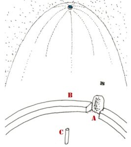 Fig. 5 – Ricostruzione grafica prospettica dell’ambiente tholoide della Gurfa, con le parti mancanti: A – “Falsa Porta” ad oriente, B – Banchine perimetrali circolari a parete, C – Palo/gnomone centrale