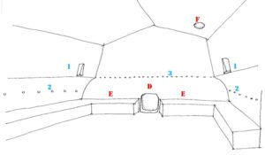 Fig. 6 – Ricostruzione grafica prospettica dell’ambiente “stalla-vano a tenda”/Cripta funeraria dinastica  del piano terra della Gurfa con le parti mancanti: D – “Falsa Porta”/incasso a settentrione, E – Banchine perimetrali a parete simmetriche rispetto alla ”Falsa Porta”/incasso (demolite in parte o trasformate in mangiatoie laterali per l’uso a stalla), F – Foro di uscita del “Pozzo di discesa (per la Catabasi)” con accesso dalla terza “stanza” del livello superiore, 1 – Sesti ad incasso per trave di carpenteria del soppalco ligneo. 2 – Fori funerari segnaposto (sei per lato), 3 – Fori di incastro per carpenteria lignea del soppalco.