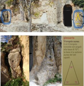 L’evidenza figurativa monumentale dei due elementi, già di per sé, deve significare qualcosa di importante; se non altro per orientare sulla “cultura del dedalico progettista/costruttore” che mette in opera l’impianto. La evidente mancanza di scopo d’uso pratico delle due sculture rafforza il loro significato simbolico nel “dialogo millenario” complessivo del sistema “Tomba/Tempio/Santuario” nel Palazzo rupestre della Gurfa, che sta alla base del nostro impianto di ricerca sulla Via della Thòlos. In questo orizzonte di ricerca iconologica risulta pertanto chiaro sia il ruolo di “guardiano della Soglia” per il monolite ad incasso “Betilo con occhi” (Fig.1b) che quello di “firma del dedalico progettista”, che dimostra di applicare conoscenze di “geometria aurea” in quella straordinaria incisione triangolare (Fig.1c). Chi volesse saperne di più su quello che pensiamo di questo aspetto d’uso di raffinate tracce di progettazione alla Gurfa può approfondire al Cap. IV.5 del nostro La Via della Thòlos, con l’aggiunta di una mia  recente verifica che riguarda l’uso di “geometria aurea” anche nella realizzazione della piccola tomba a thòlos esterna a ridosso degli ipogei (Fig.2). E’ un dettaglio importante che conferma l’intervento unitario di progettazione e riadattamento, con arretramento della parte del fronte di scavo del piano terra e primo, “per necessità di causa importante sopravvenuta”, della precedente necropoli sicana nel sito, di cui restano le sole tombe a grotticella più antiche del terzo livello. Per la piccola tomba a thòlos esterna, con caratteristico “scodellino apicale” (censita come C.11-75 da F. Tomasello), da sempre ho intuito che potesse trattarsi proprio della “Tomba del dedalico costruttore”, con identica esposizione e giacitura della thòlos monumentale con Oculus.