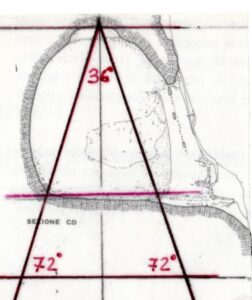 Fig. 2 – Sovrapposizione del “Triangolo Aureo” nella sezione trasversale della tomba a thòlos C.11-75 della Gurfa (Rilievo da: F. Tomasello, Le tombe a tholos della Sicilia centro meridionale, Cronache di Archeologia n.34-35, ed. CNR-Università di Catania, 1997, pp.146-148)