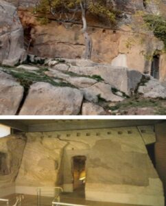 Fig. 4 ab – Particolare esterno della parete della Gurfa e Tempietto rupestre di Ellessya fatto scavare dal Faraone Thutmose III (ca 1430 a.C.), ricostruito al Museo Egizio di Torino. Prospetti rupestri esterni con sesti di incastro per ‘pronao’-riparo/tettoia di carpenteria lignea.