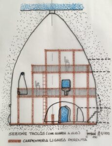 Quella struttura lignea interna di controfacciata con due livelli doveva servire anche da scenario per “esporvi” grandi immagini e sistemi di segni con valore fondativo per la comunità “riservata” che partecipava ai riti. Temi iconografici e coordinate simboliche di una sorta di “teatro per le Ierofanie” e le “investiture sacrali” che vi si dovevano svolgere a date calendarizzate. Anche sulla base dell’interesse che Silvana Braida mostrò per quei “fori” dei soppalchi nel suo disegno in sezione della thòlos (Fig. 2), mi sono permesso di completare l’opera ricostruendone un’immagine grafica di sintesi con i soppalchi (Fig. 3).