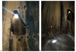 Possiamo immaginarlo così: durante la “sacra rappresentazione” lo ierofante, in alcune fasi assieme ai convenuti, riproponeva l’azione rituale di Tradizione con la diretta partecipazione emotiva e fisica dei presenti. La degustazione di particolari cibi doveva essere una delle componenti base dei riti: era quindi necessario avere a disposizione un angolo per la preparazione del pasto rituale oltre che del fuoco sacro e l’acqua consacrata. Motivo per cui alla Gurfa, nel primo soppalco c’è quello che sembra un semplice originario monumentale “camino con sedile interno”, il cui foro di uscita dei fumi serve anche come foro/gnomone della suggestiva lama di luce che segna il mezzogiorno solare dei due equinozi colpendo esattamente quello che resta di una fossa pavimentale centrale (Fig. 4ab)